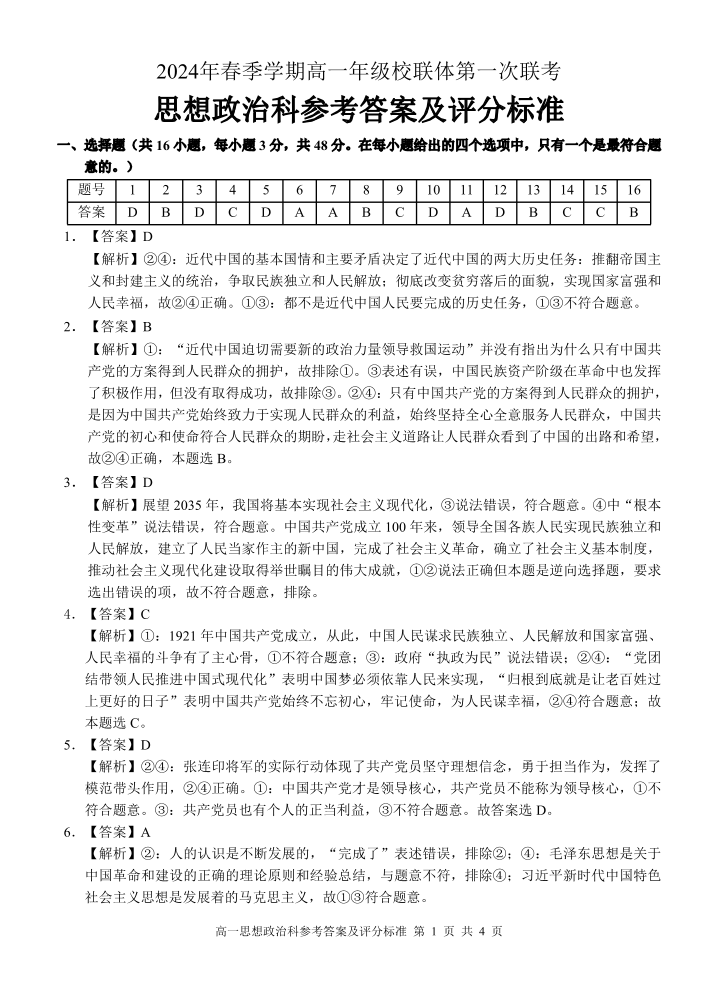广西壮族自治区河池市十校2023-2024学年高一下学期4月联考政治答案