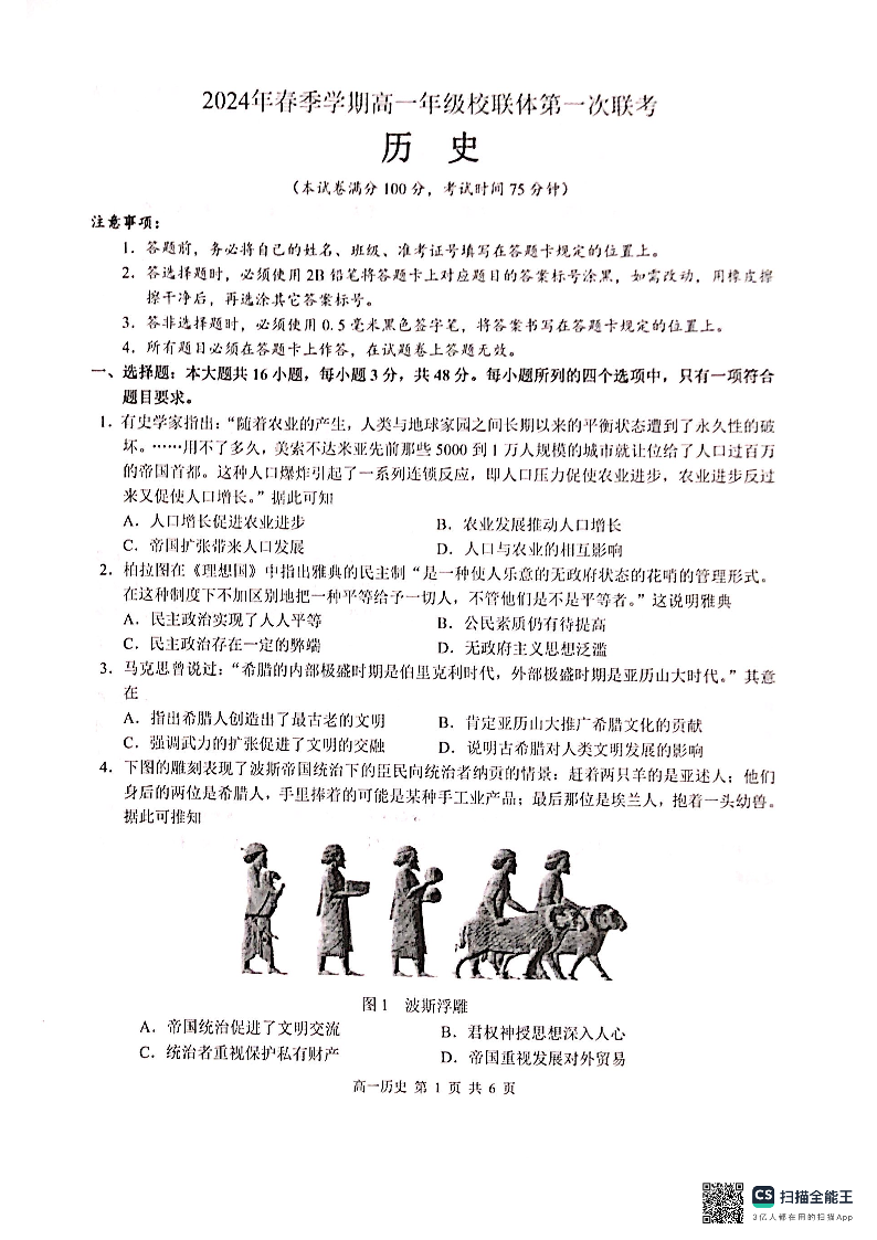 广西壮族自治区河池市十校2023-2024学年高一下学期4月联考历史