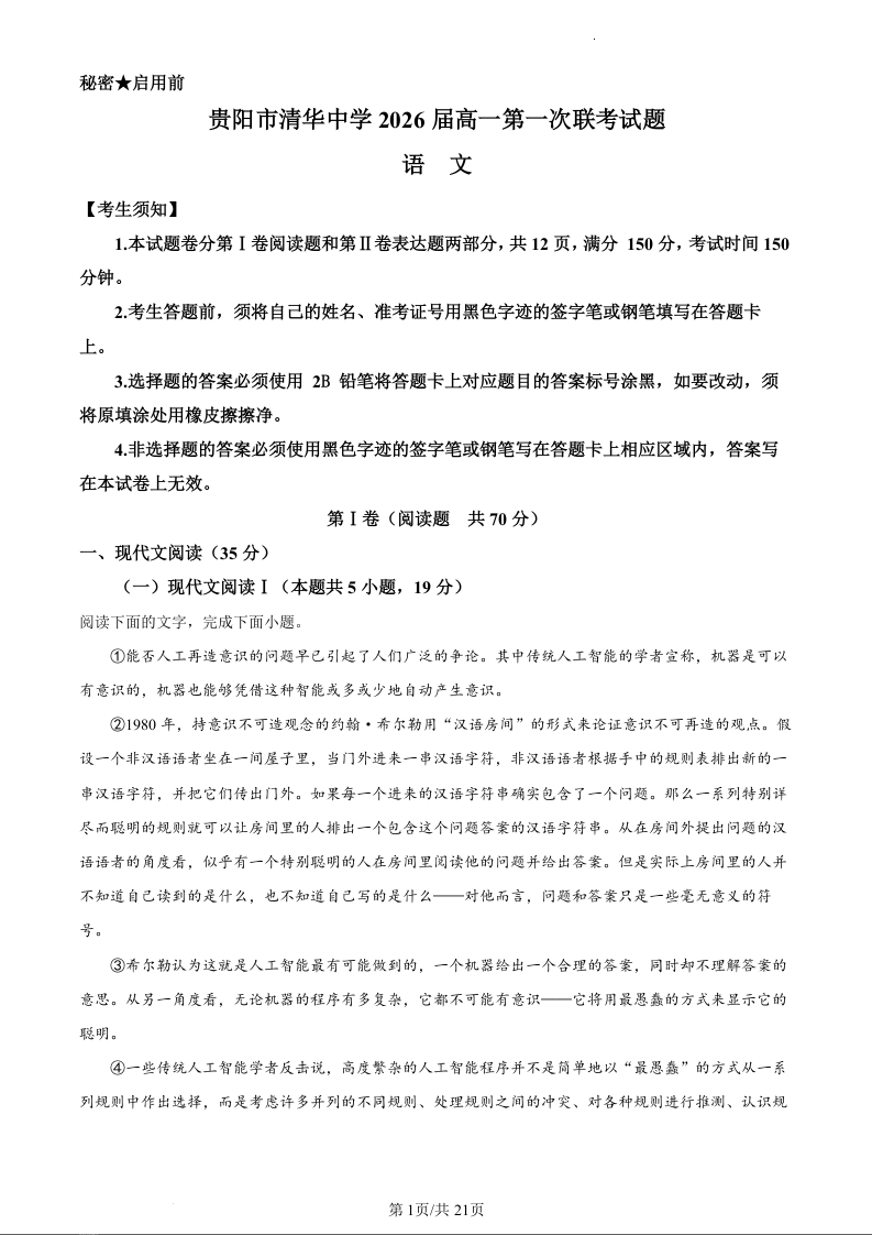 贵州省贵阳市清华中学、安顺一中等校2023-2024学年高一下学期第一次联考语文(精品解析版)