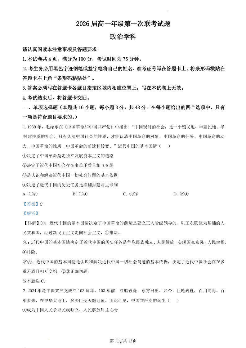 贵州省贵阳市清华中学、安顺一中等校2023-2024学年高一下学期第一次联考政治(精品解析版)