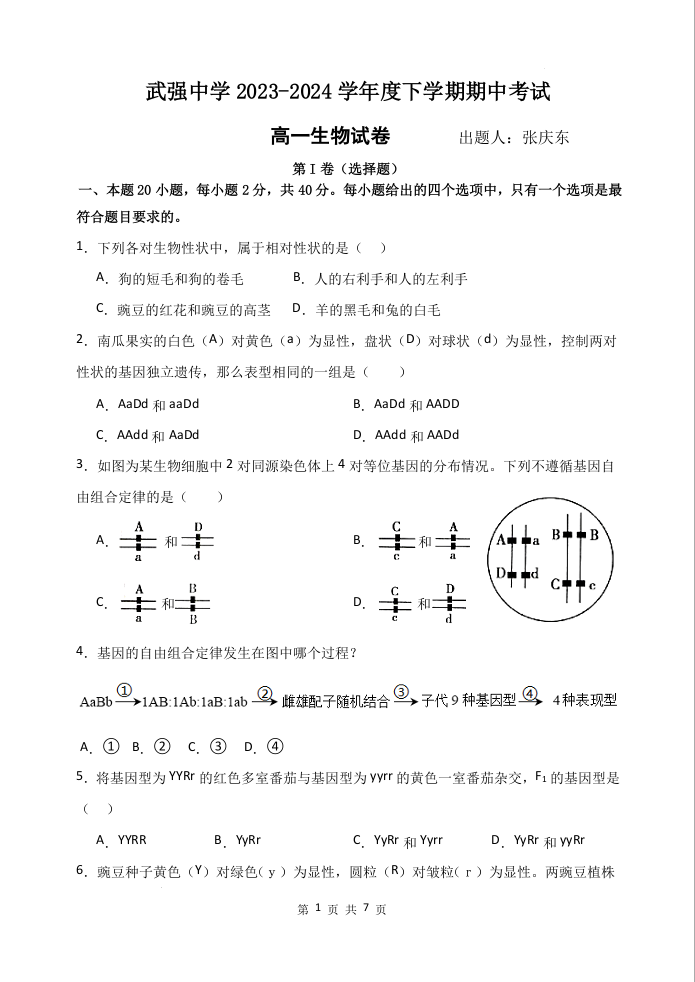 河北武强中学2023-2024学年高一下学期期中考试生物