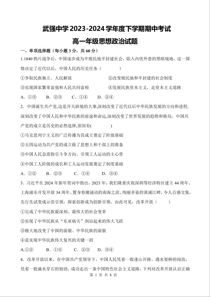 河北武强中学2023-2024学年高一下学期期中考试政治