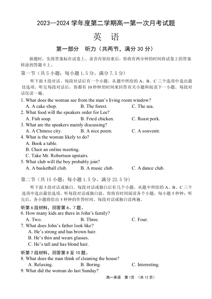海南省文昌中学2023-2024学年高一下学期第一次月考英语