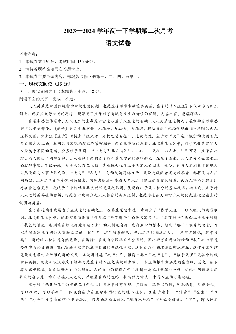河南省部分学校2023-2024学年高一下学期4月期中考试语文+答案