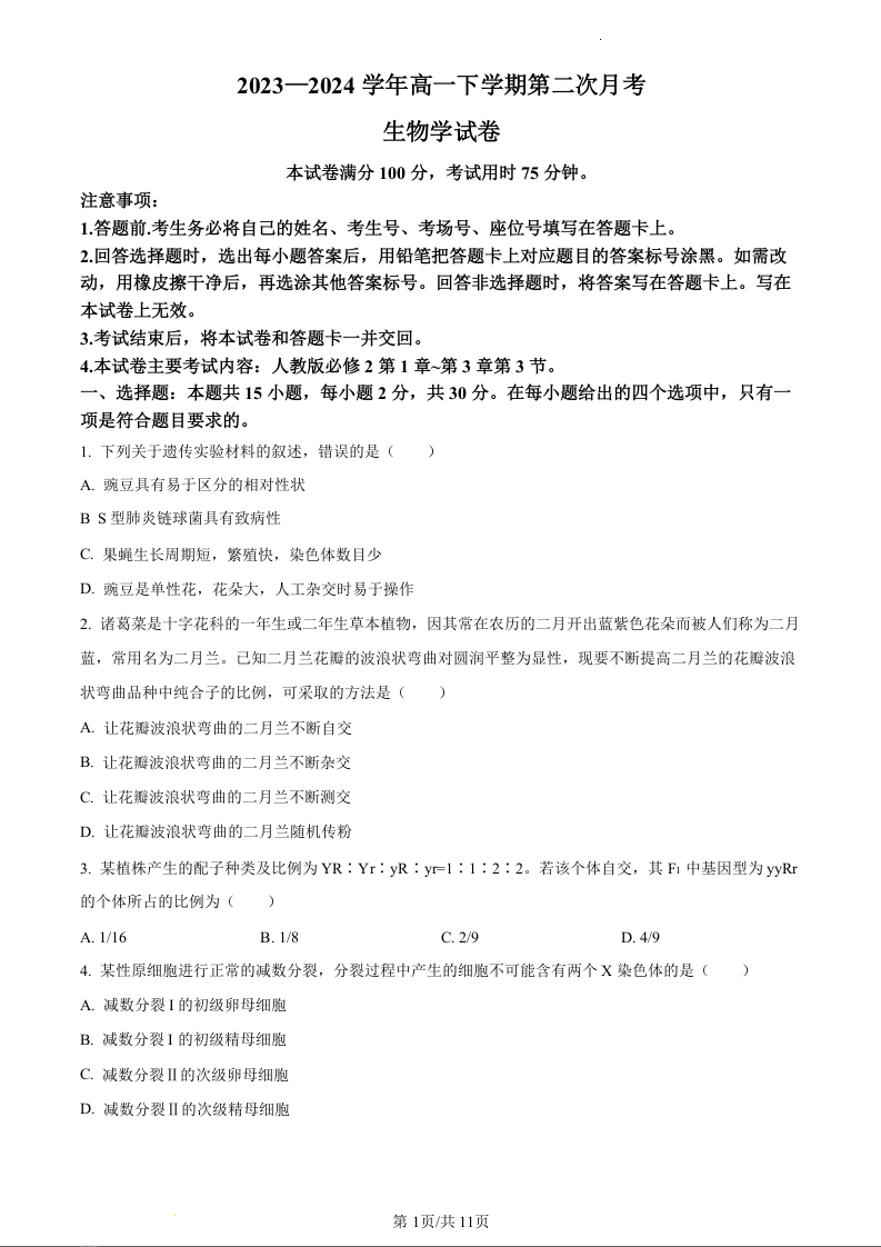 河南省部分学校2023-2024学年高一下学期4月期中考试生物+答案