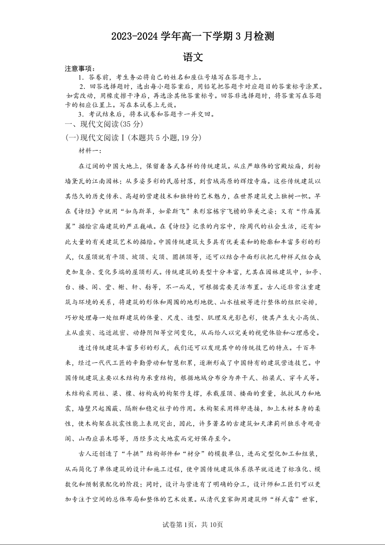 河南省漯河市高级中学2023-2024学年高一下学期3月月考语文