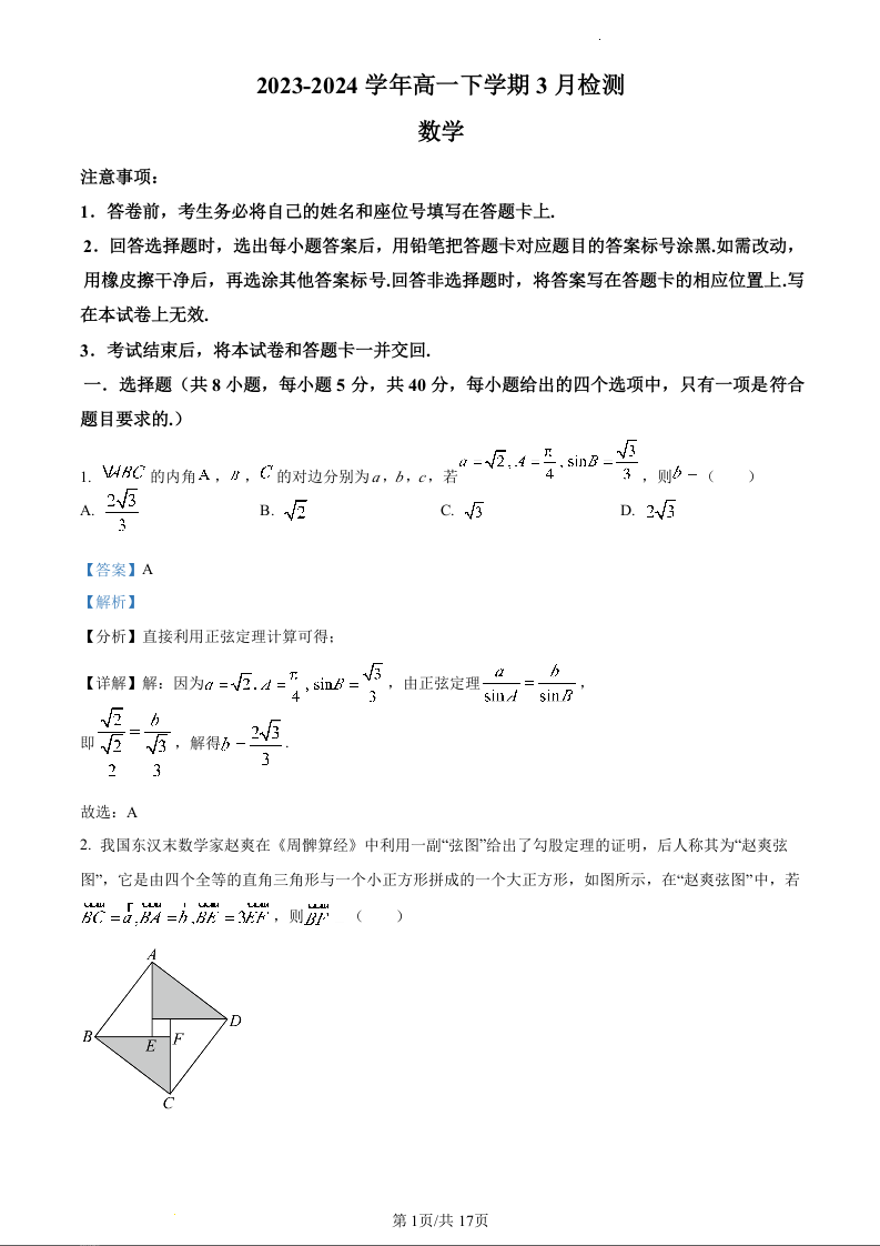 河南省漯河市高级中学2023-2024学年高一下学期3月月考数学(精品解析版)