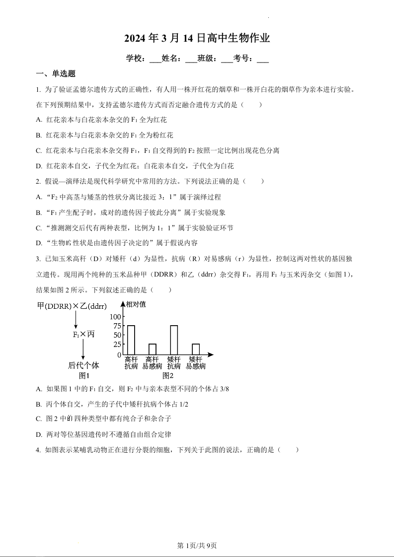 河南省漯河市高级中学2023-2024学年高一下学期3月月考生物(原卷版)