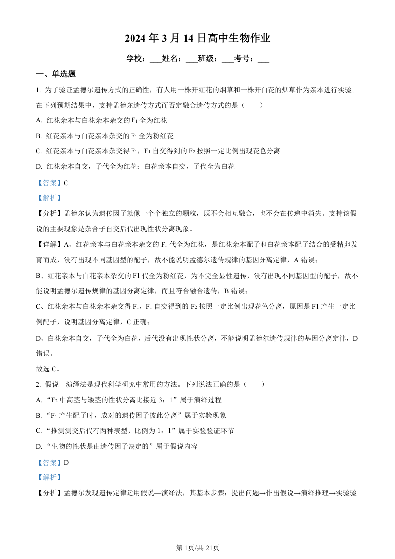 河南省漯河市高级中学2023-2024学年高一下学期3月月考生物(精品解析版)