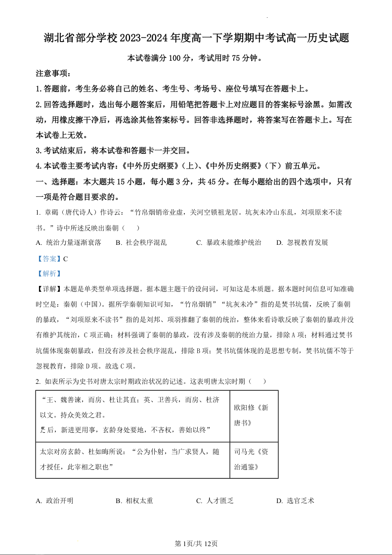 湖北省部分学校2023-2024学年高一下学期4月期中考试历史(精品解析版)