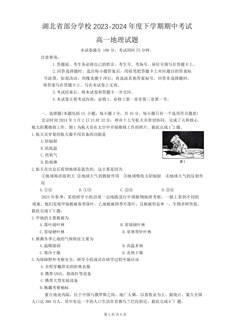 湖北省部分学校2023-2024学年高一下学期4月期中考试地理+答案