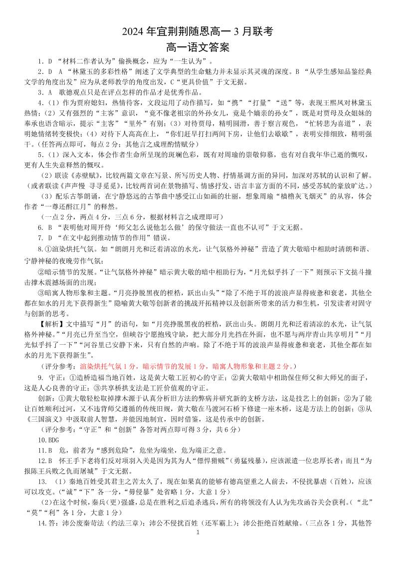 湖北省宜昌、荆门、荆州、随州、恩施2023-2024学年高一下学期3月联考语文答案