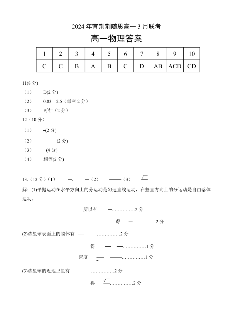 湖北省宜昌、荆门、荆州、随州、恩施2023-2024学年高一下学期3月联考物理答案