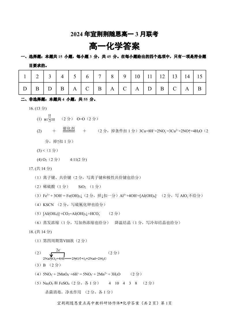 湖北省宜昌、荆门、荆州、随州、恩施2023-2024学年高一下学期3月联考化学答案