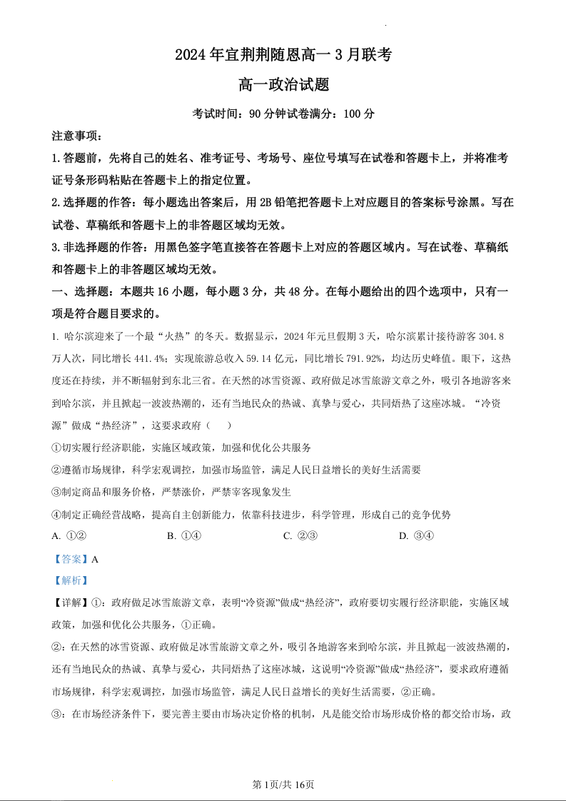 湖北省宜昌、荆门、荆州、随州、恩施2023-2024学年高一下学期3月联考政治(精品解析版)