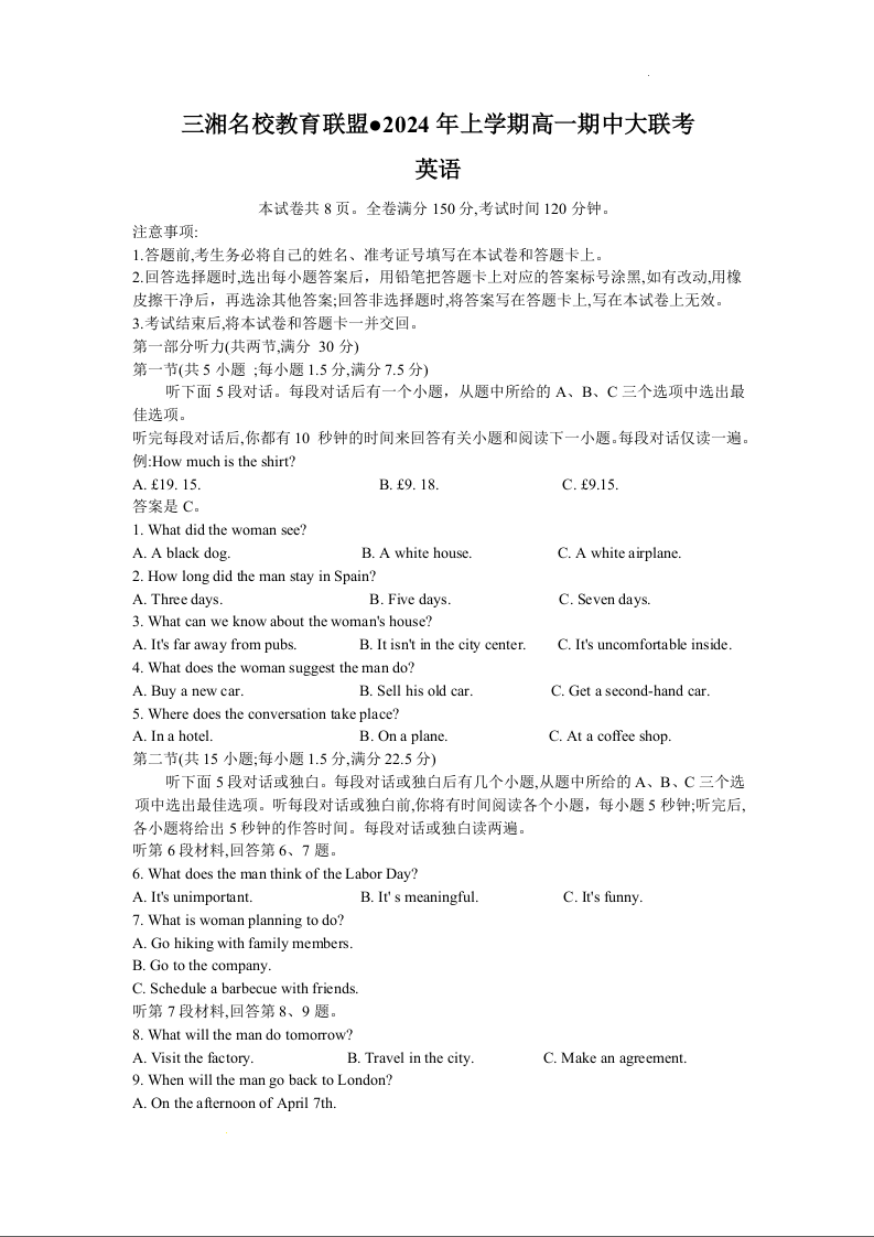 湖北省部分学校2023-2024学年高一下学期4月期中考试英语