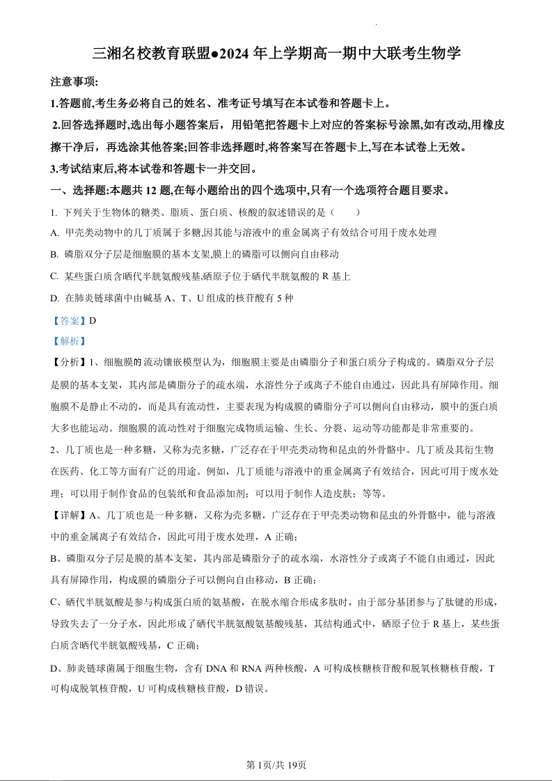湖南省三湘名校联考2023-2024学年高一下学期4月期中考试生物(精品解析版)