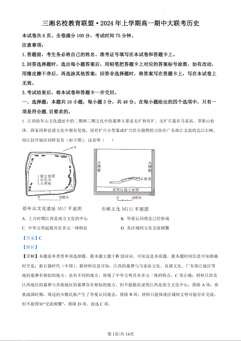 湖南省三湘名校联考2023-2024学年高一下学期4月期中考试历史(精品解析版)