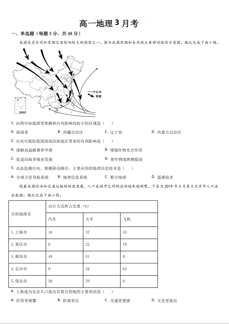 吉林省通化市梅河口市第五中学2023-2024学年高一下学期4月月考地理+答案