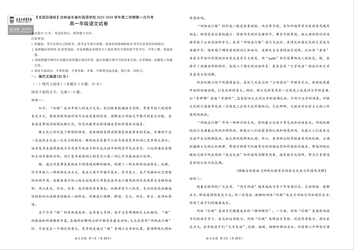 吉林省长春市长春外国语学校2023-2024学年高一下学期4月月考语文+答案