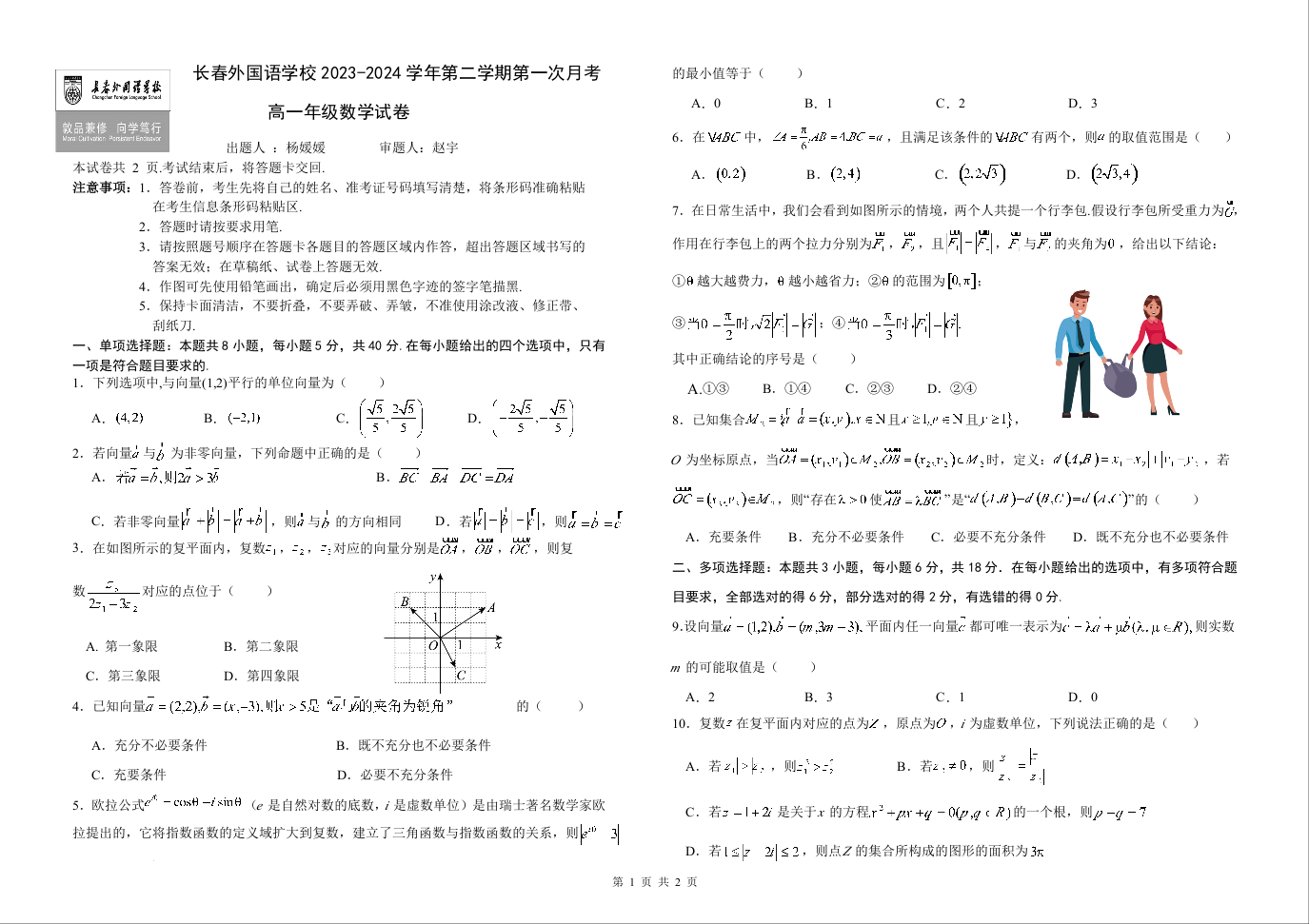 吉林省长春市长春外国语学校2023-2024学年高一下学期4月月考数学+答案