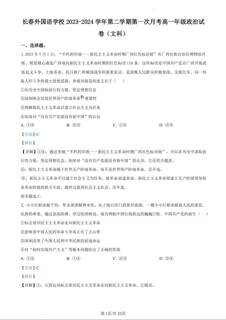 吉林省长春市长春外国语学校2023-2024学年高一下学期4月月考政治(精品解析版)