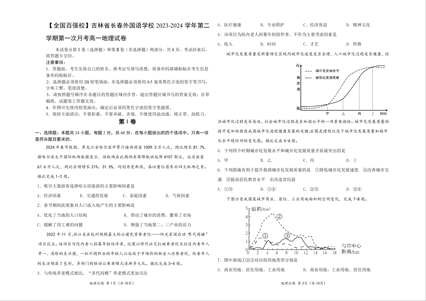 吉林省长春市长春外国语学校2023-2024学年高一下学期4月月考地理+答案