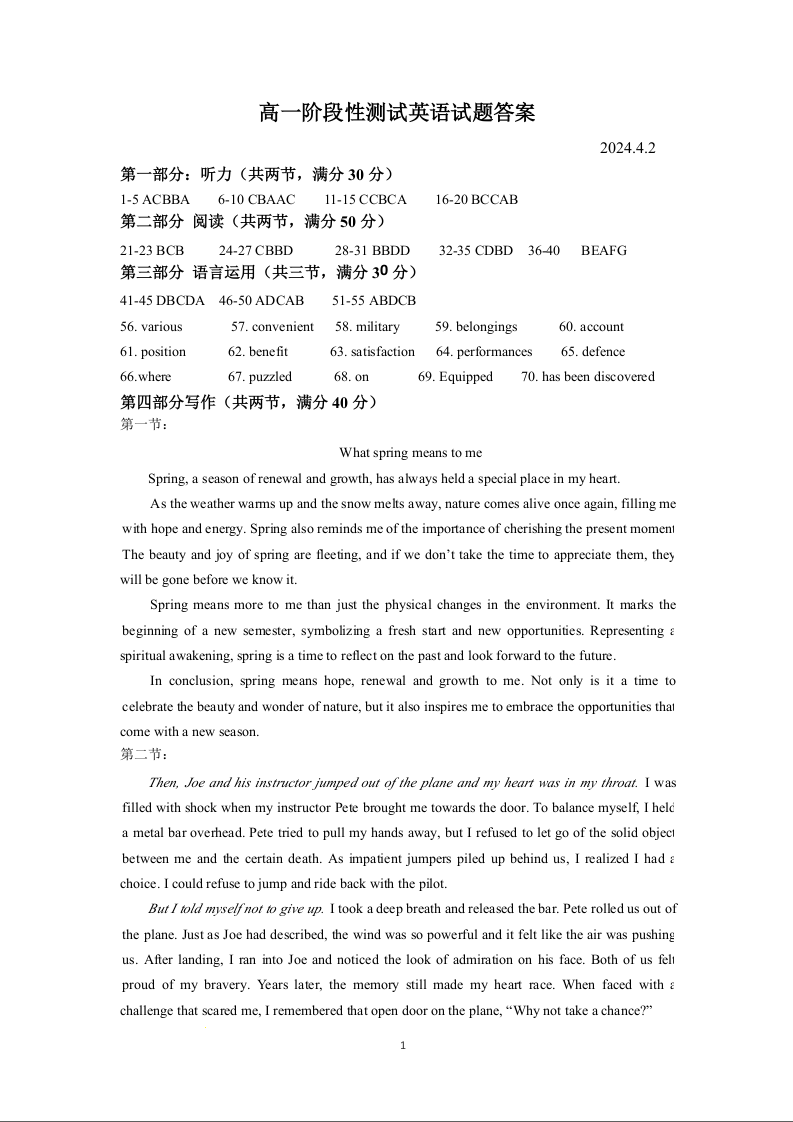 山东省济宁市第一中学2023-2024学年高一下学期4月阶段性测试英语答案