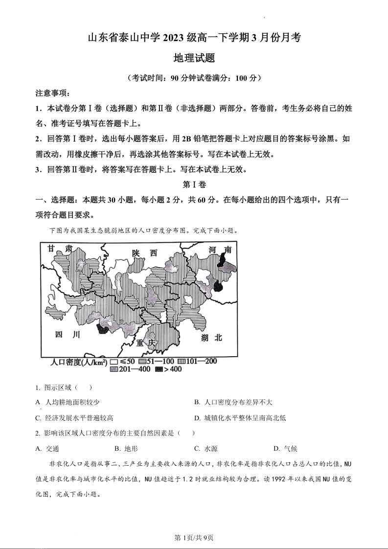 山东省泰安市泰山中学2023-2024学年高一3月月考地理(原卷版)