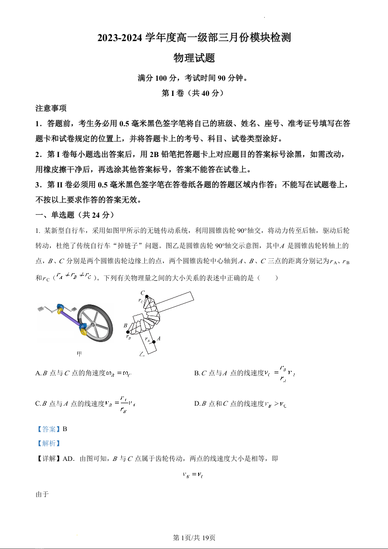山东省威海市乳山市银滩高级中学2023-2024学年高一下学期3月月考物理(精品解析版)