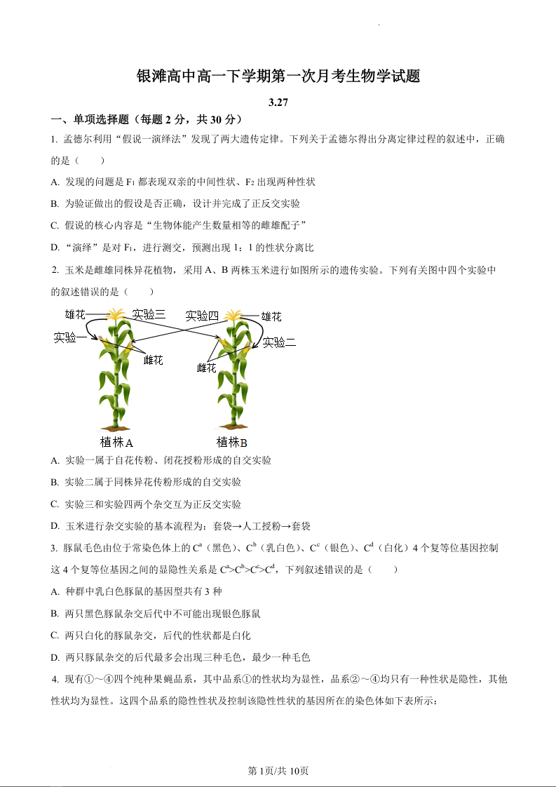 山东省威海市乳山市银滩高级中学2023-2024学年高一下学期3月月考生物(原卷版)
