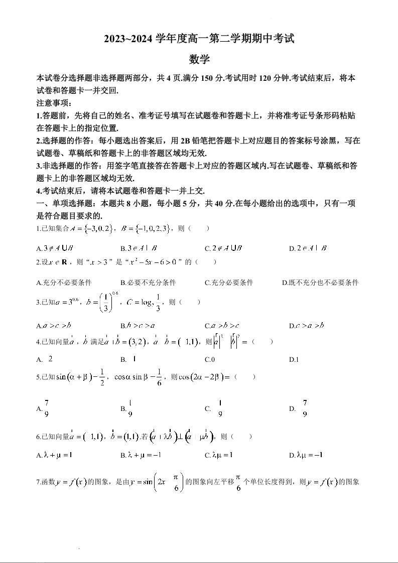 陕西省安康市2023-2024学年高一下学期4月期中考试数学