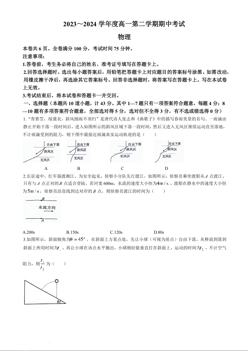 陕西省安康市2023-2024学年高一下学期4月期中考试物理