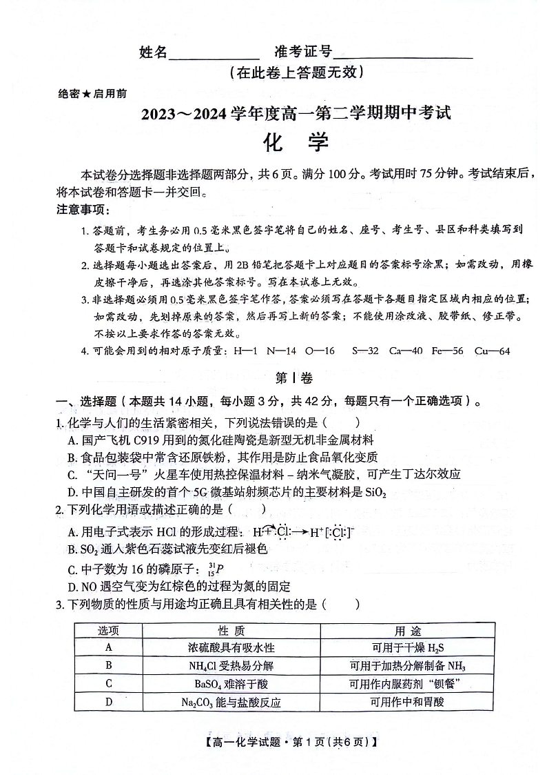 陕西省安康市2023-2024学年高一下学期4月期中考试化学