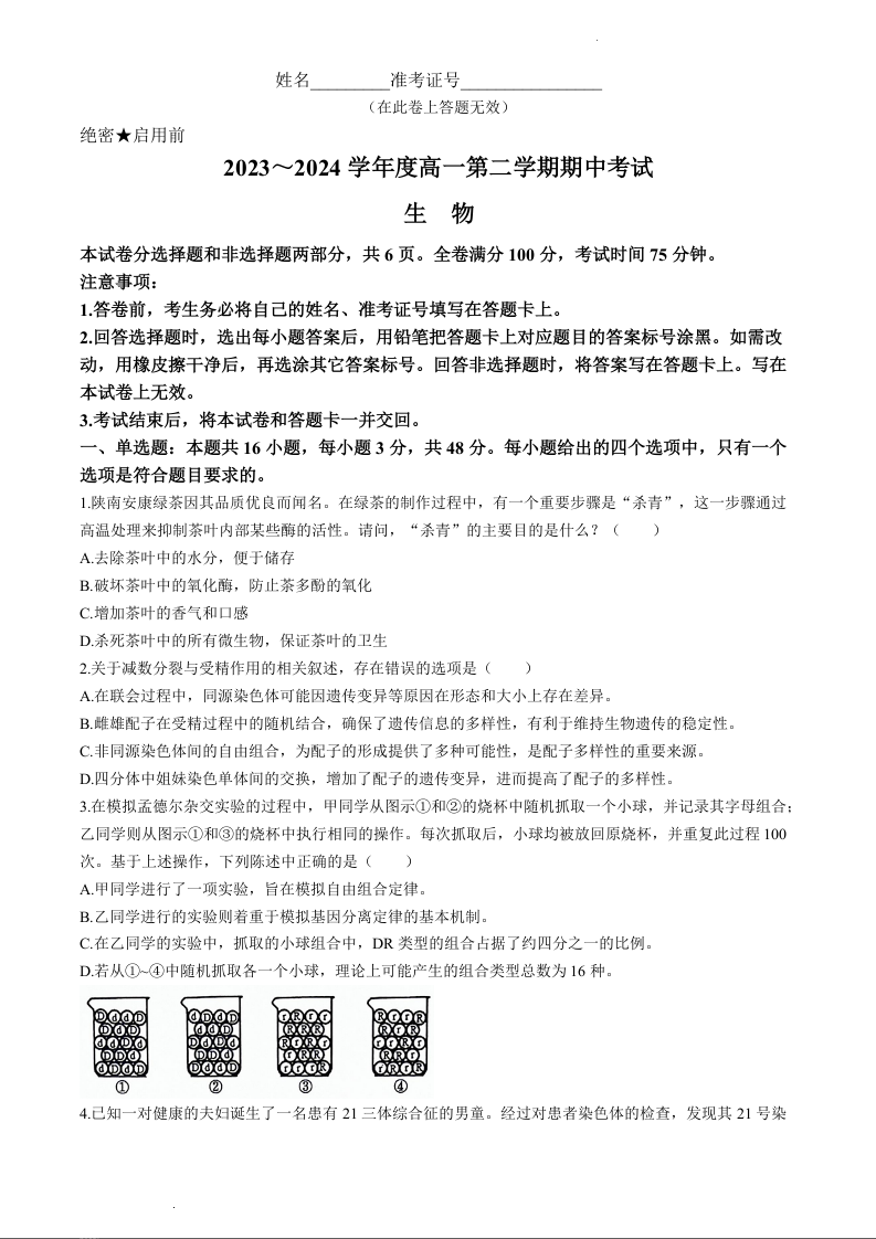 陕西省安康市2023-2024学年高一下学期4月期中考试生物