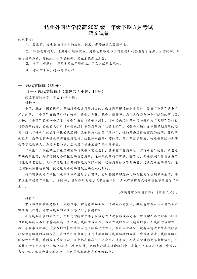 四川省达州外国语学校2023-2024学年高一下学期3月月考语文