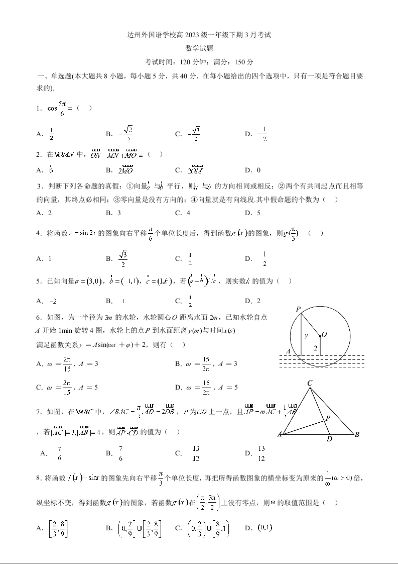 四川省达州外国语学校2023-2024学年高一下学期3月月考数学
