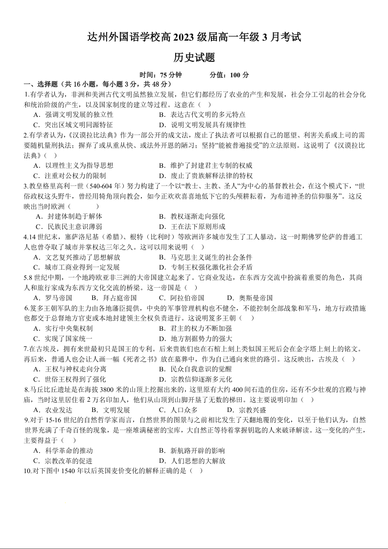 四川省达州外国语学校2023-2024学年高一下学期3月月考历史