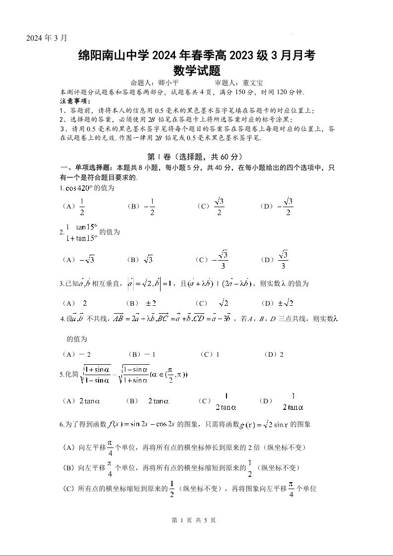 四川省绵阳市南山中学2023-2024学年高一下学期3月月考数学