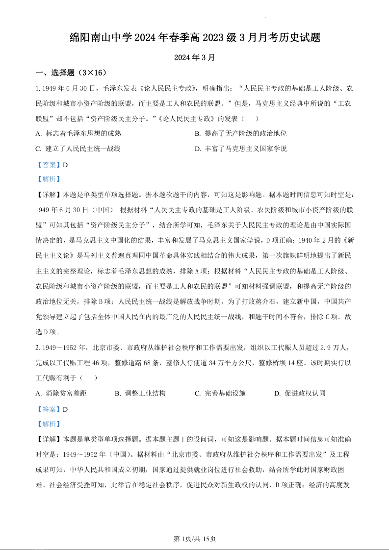 四川省绵阳市南山中学2023-2024学年高一下学期3月月考历史(精品解析版)