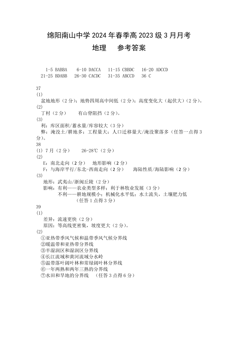 四川省绵阳市南山中学2023-2024学年高一下学期3月月考地理答案