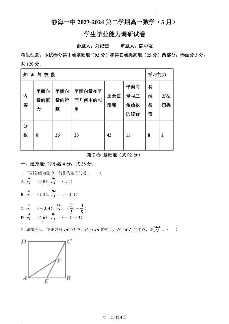 天津市静海区第一中学2023-2024学年高一下学期3月月考数学(原卷版)