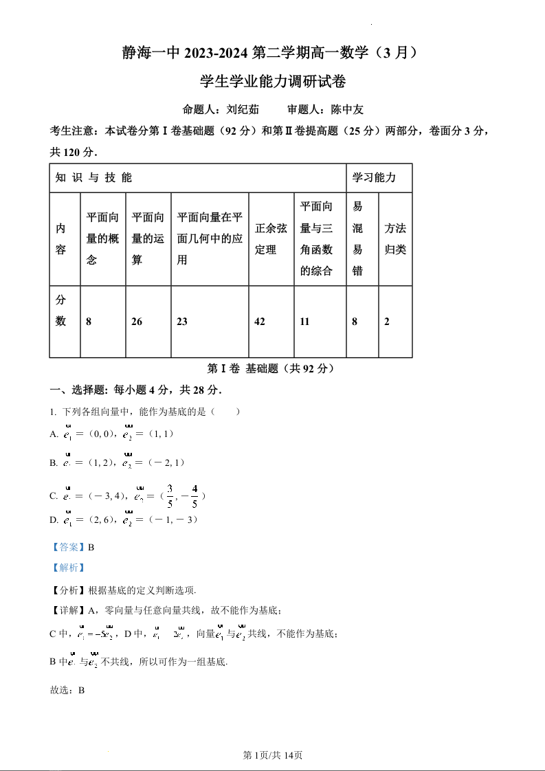 天津市静海区第一中学2023-2024学年高一下学期3月月考数学(精品解析版)