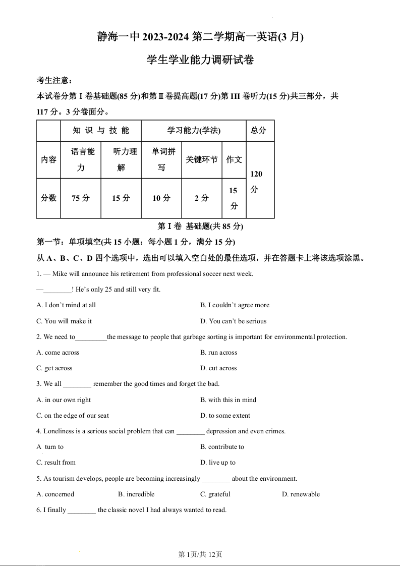 天津市静海区第一中学2023-2024学年高一下学期3月月考英语(原卷版)