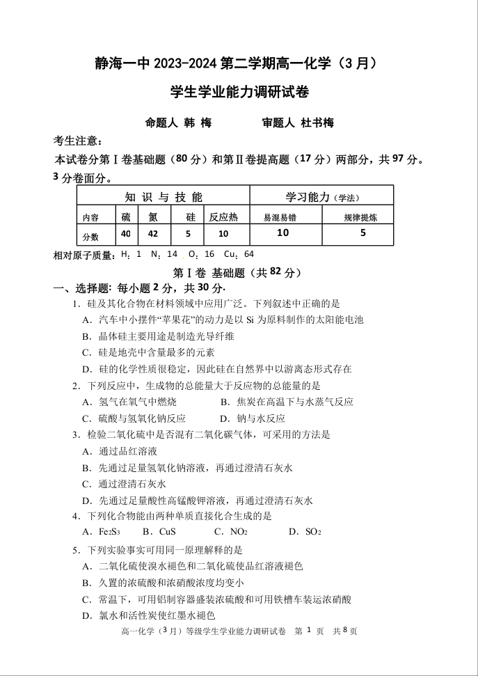 天津市静海区第一中学2023-2024学年高一下学期3月月考化学