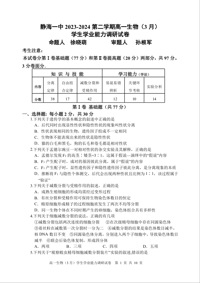 天津市静海区第一中学2023-2024学年高一下学期3月月考生物