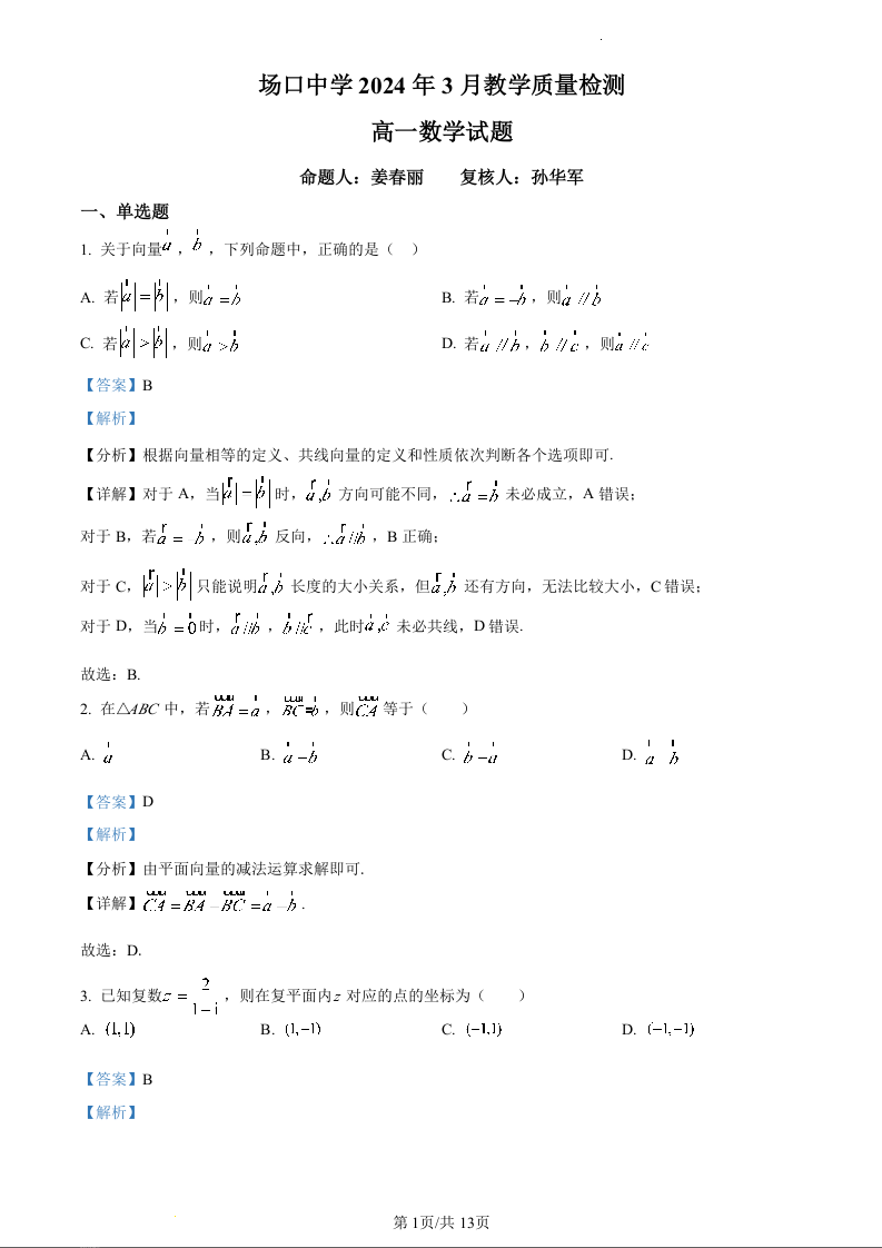 浙江省杭州市富阳区场口中学2023-2024学年高一下学期3月月考数学(精品解析版)