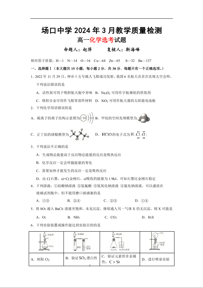 浙江省杭州市富阳区场口中学2023-2024学年高一下学期3月月考化学