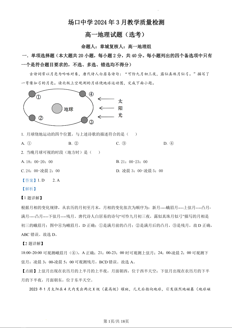 浙江省杭州市富阳区场口中学2023-2024学年高一下学期3月月考地理(精品解析版)