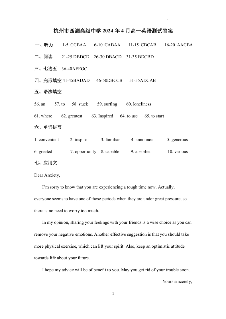 浙江省杭州市西湖高级中学2023-2024学年高一下学期4月期中考试英语答案